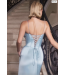 Truly unique, this eye-catching long formal dress features a bustier-style bodice with beaded sweetheart neckline and thin bands that lace up over the open back. In misses and some plus sizes, this elegant evening gown has tummy-camouflaging ruching and a thigh-high side slit that adds a flirty look for prom, galas, and other formal events. A contemporary style with a fashion-forward look, this bustier-bodice long prom dress is sure to kick up the wow factor at your big formal.