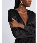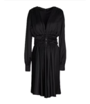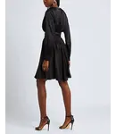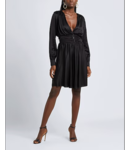 Short satin dress with a deep V-neckline, buttoned cuffs, zipper and detail at the waist with three decorative buttons. The monochrome Made in Italy model is characterized by its sophisticated draping and long sleeves, and the model wears an Italian size S/40.